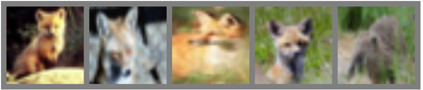 Transformers offer the perfect architecture for set problems as the Multi-Head Attention is permutation-equivariant, and thus, outputs the same values no matter in what order we enter the inputs (inputs and outputs are permuted equally). The task we are looking at for sets is Set Anomaly Detection which means that we try to find the element(s) in a set that does not fit the others. A common application of anomaly detection is performed on a set of images, where images belong to the same category/have the same high-level features while one belongs to another category. Note that category does not necessarily have to relate to a class in a standard classification problem, but could be the combination of multiple features. For instance, on a face dataset, this could be people with glasses, male, beard, etc. An example of distinguishing different animals can be seen below. The first four images show foxes, while the last represents a different animal. We want to recognize that the last image shows a different animal, but it is not relevant which class of animal it is.